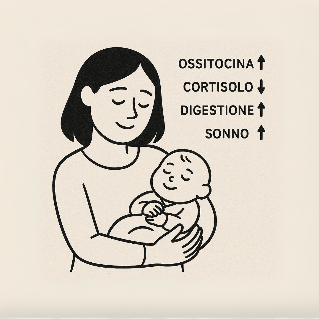 Il contatto attento e amorevole attiva ossitocina, calma il sistema nervoso e favorisce sonno, digestione e sicurezza emotiva.